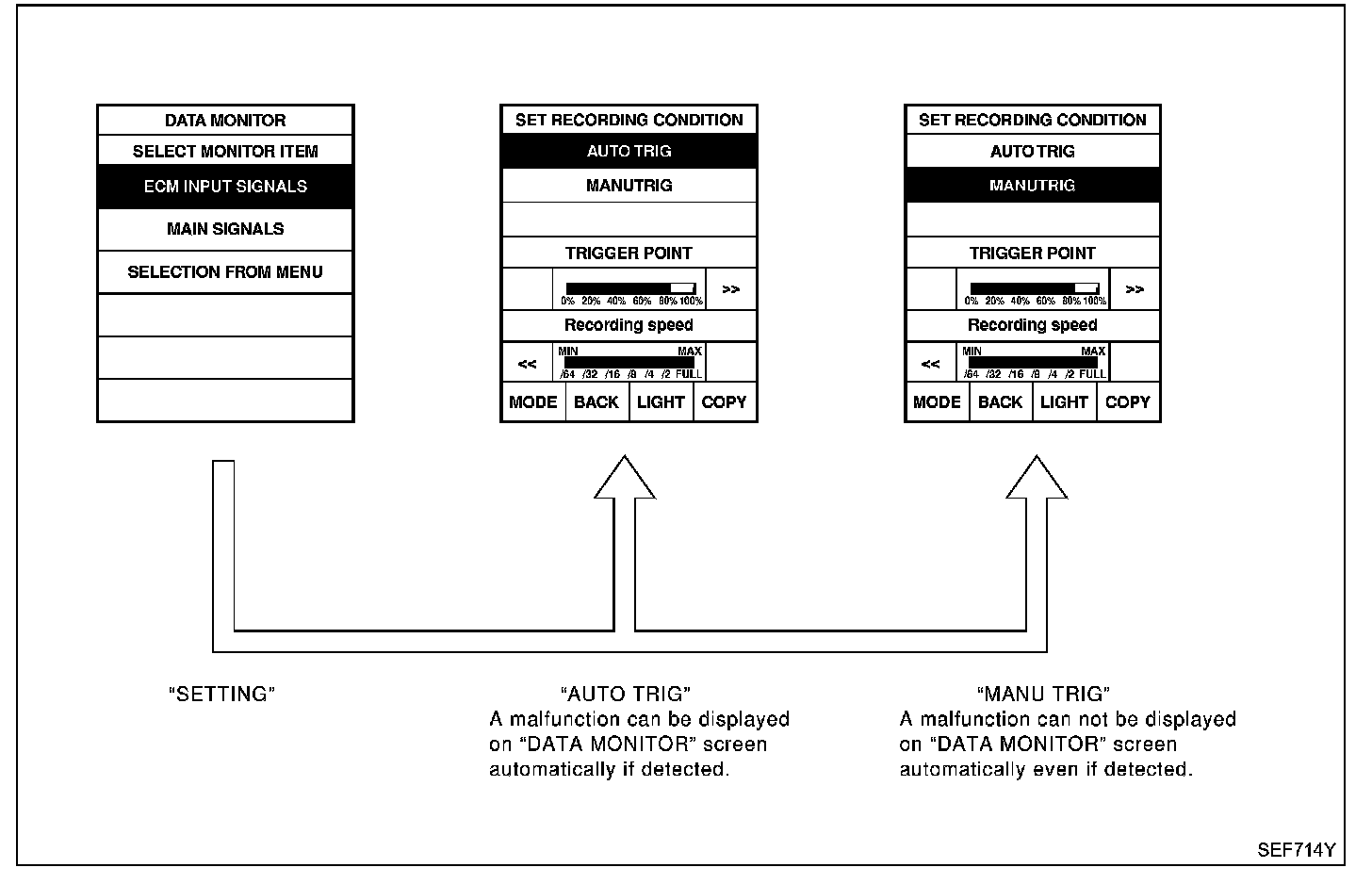 CONSULT-II has two kinds of triggers and they can be selected by touching "SETTING" in "DATA MONITOR" mode.