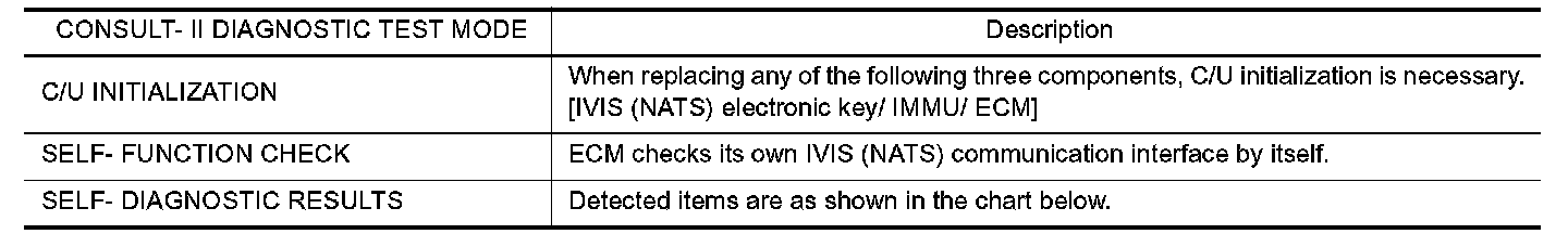 NOTE: When any initialization is performed, all ID numbers previously registered will be erased and all IVIS (NATS) electronic keys must be registered again. The engine cannot be started with an unregistered key. The system will show "DIFFERENCE OF KEY" or "LOCK MODE" as a self-diagnostic result on the CONSULT-II screen.