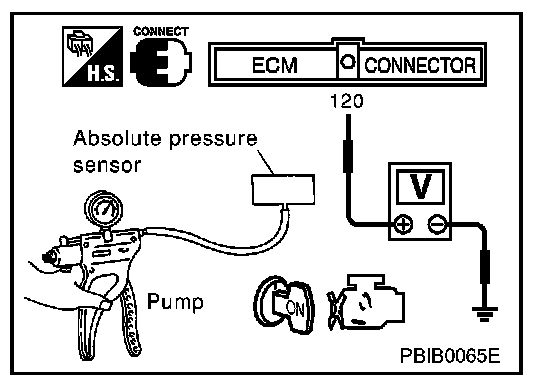 4. Turn ignition switch "ON" and check output voltage between ECM terminal 120 and engine ground under the following conditions.