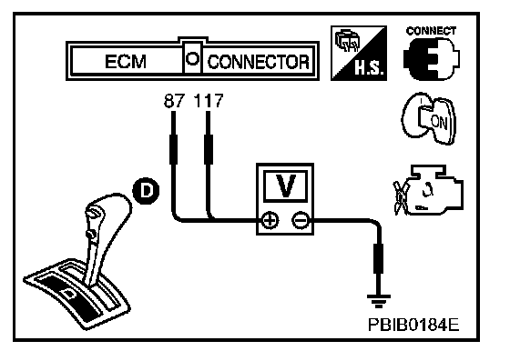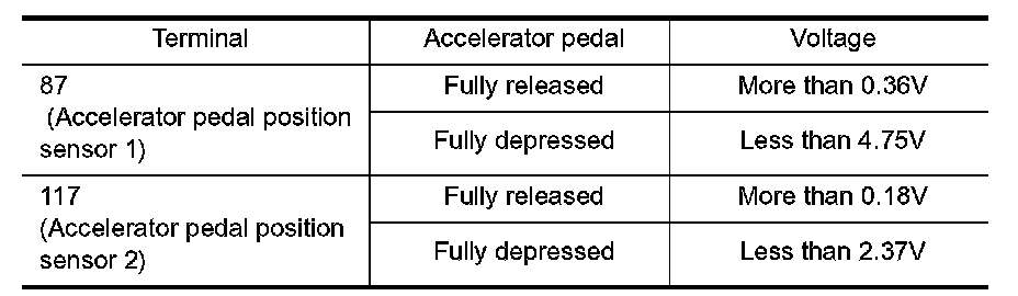 5. Check voltage between ECM terminals 87 (APP sensor 1 signal), 117 (APP sensor 2 signal) and engine ground under the following conditions.
