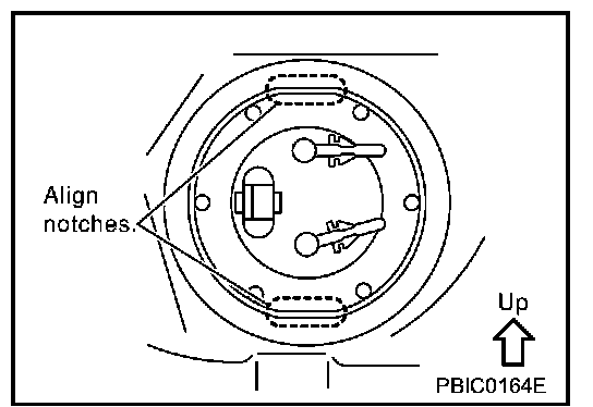 - Set the fuel tube connector of the fuel level sensor unit facing the right side of the vehicle. Install it by matching the notches on its outer circumferences and the fuel tank.