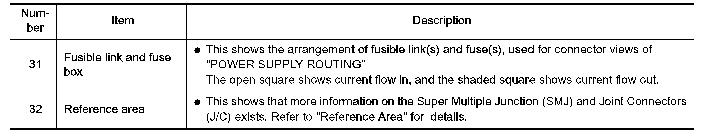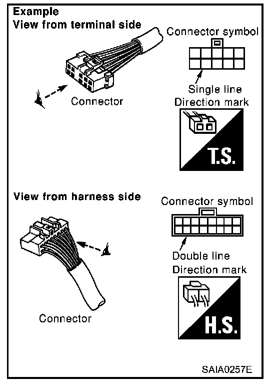 - Connector symbols shown from the harness side are enclosed by a double line and followed by the direction mark.