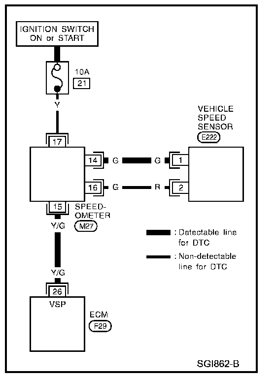 - A line with regular weight (wider line) represents a "detectable line for DTC (Diagnostic Trouble Code)". A "detectable line for DTC" is a circuit in which ECM can detect its malfunctions with the on board diagnostic system.