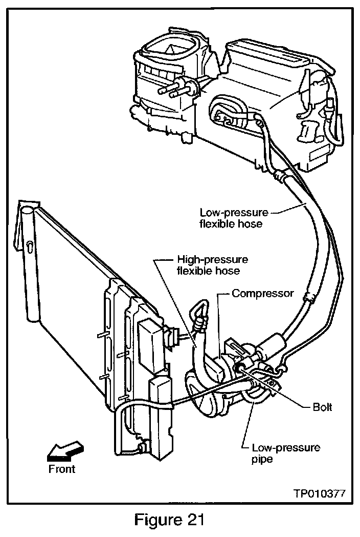 8. Remove the high-pressure flexible hose between the compressor and the condenser (see Figure 21).