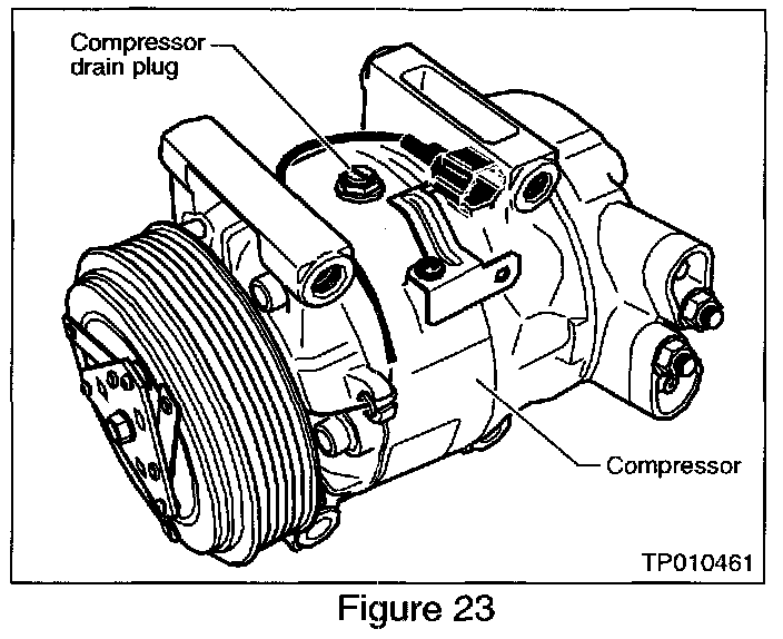 22. Drain all of the oil from the replacement compressor through the compressor drain plug (see Figure 23 for drain plug location) into a clean graduated cylinder with capacity of at least 200 cc. The replacement compressor can be found in the A/C Service Kit.