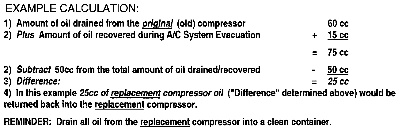 23. Measure out a quantity of new compressor oil equal to the amount of total oil removed from the old compressor plus the amount recovered from the A/C System Evacuation, minus 50 cc. Basically, you will be putting 50 cc less oil back into the new compressor.