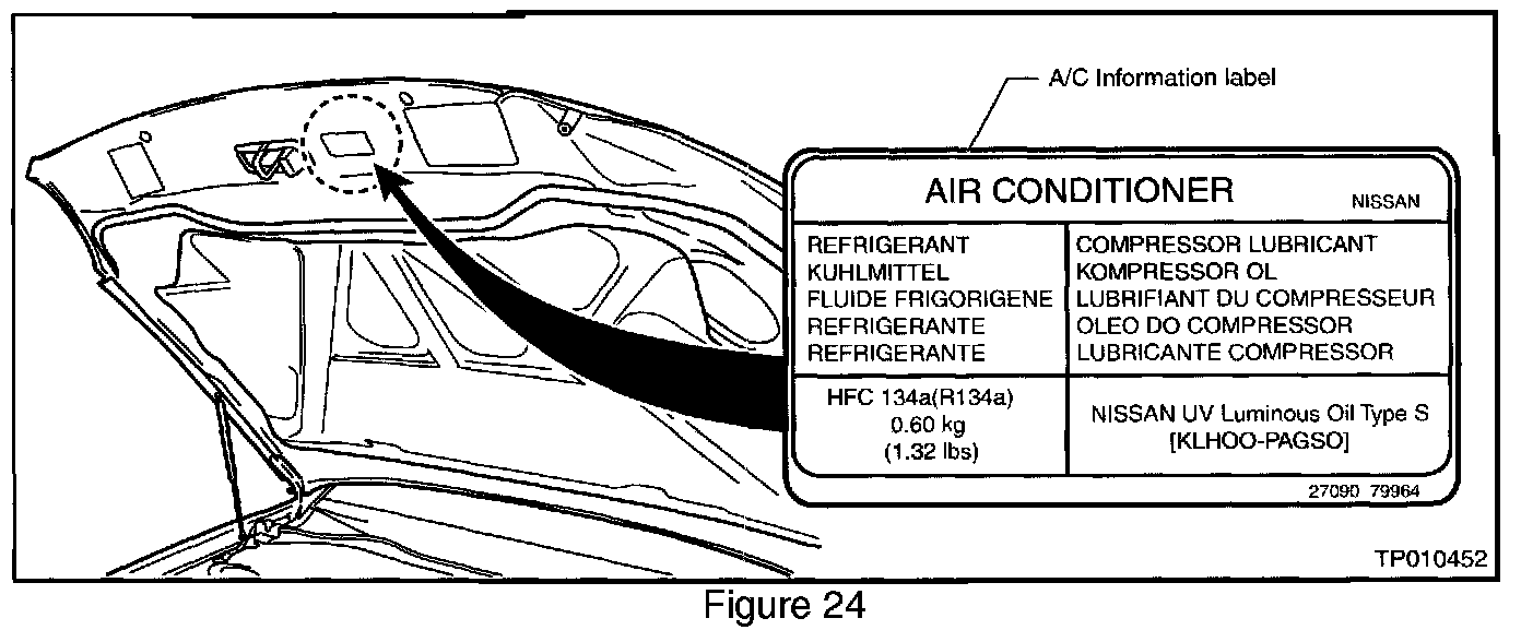 37. Replace the A/C information label with the new label provided in the A/C Service Kit (which shows increased refrigerant amount of 0.60 kg (1.32 lbs). See Figure 24.