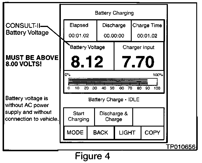 26. After about one minute has passed, check the CONSULT-II's battery voltage reading on the CONSULT-II screen (see Figure 4).