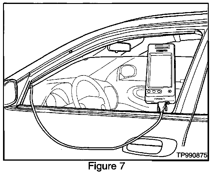 35. Roll down the driver's window part way, exit the vehicle, close the door and hang the CONSULT-II unit on the outside of the window (see Figure 7).