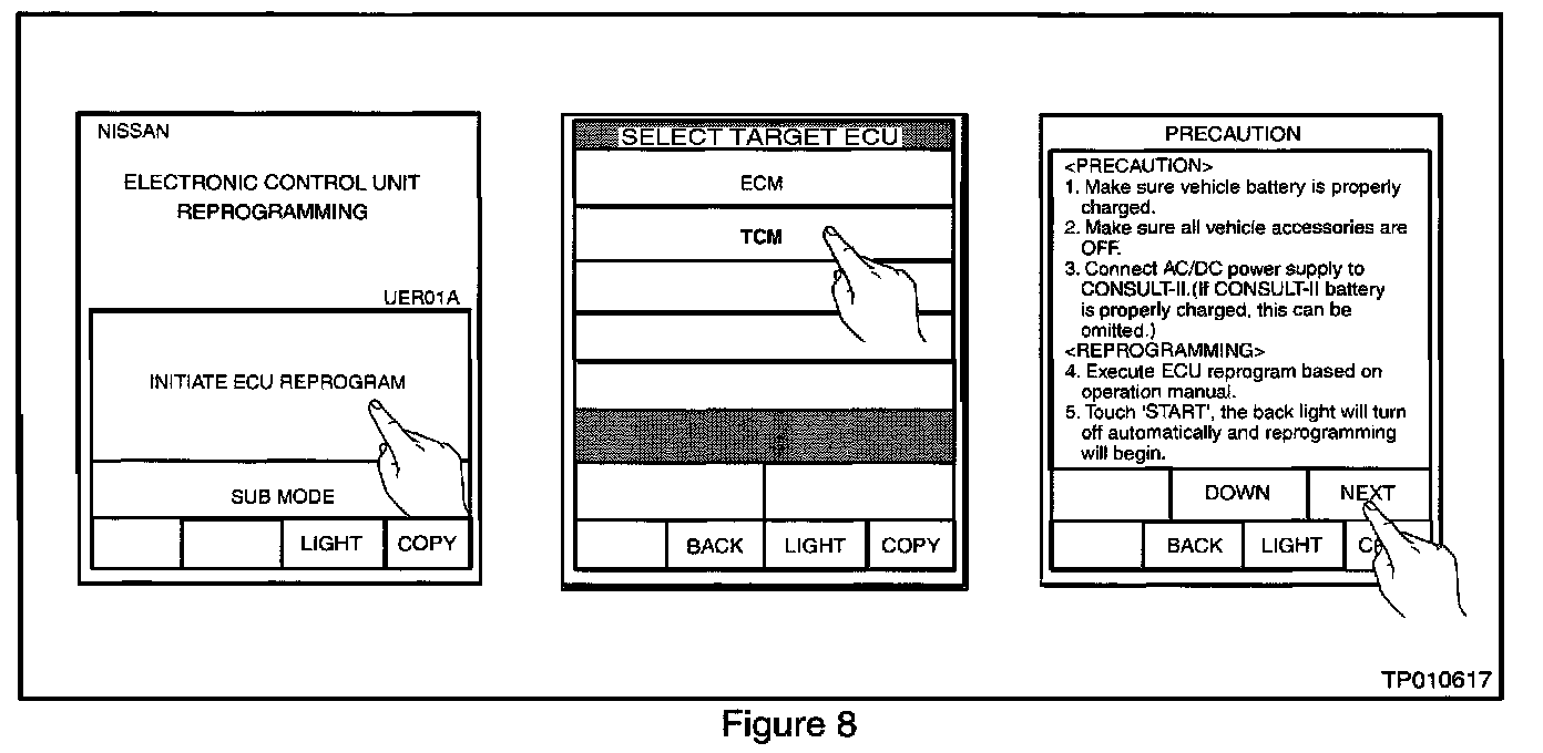 ^ Charge the CONSULT-II battery before proceeding with TCM Reprogramming