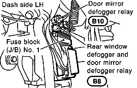 Dash Side LH, Door Mirror Defogger Relay, Fuse Block, Rear Window Defogger And Door Mirror Defogger Relay: