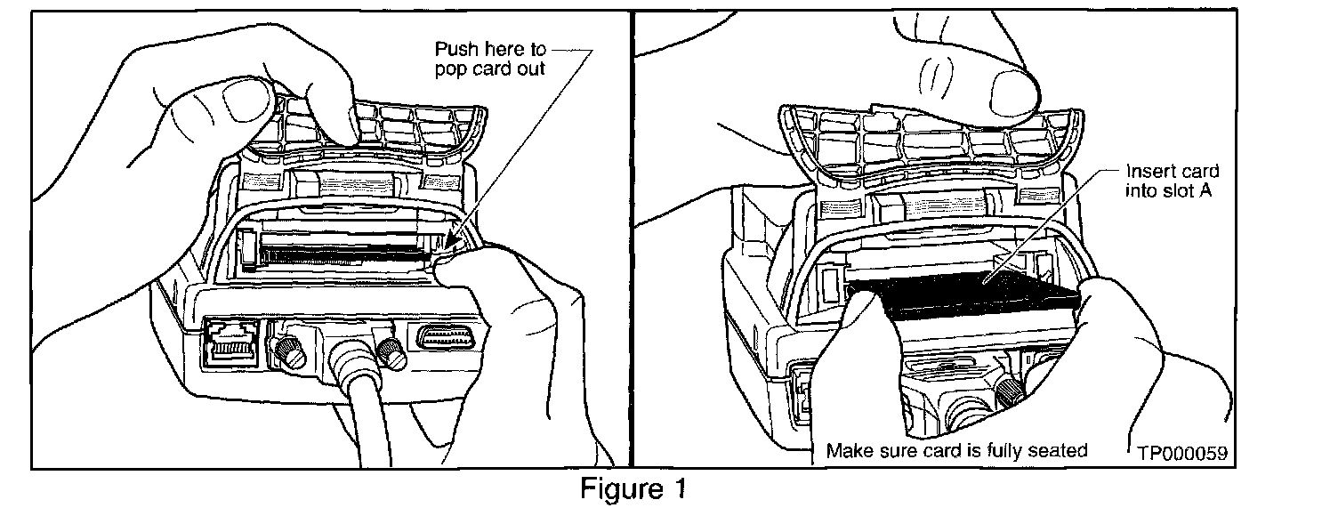 1. Remove the Diagnostics Card (blue) and install the ECM Reprogramming Software Card (orange) into slot A of CONSULT-II (see Figure 1).