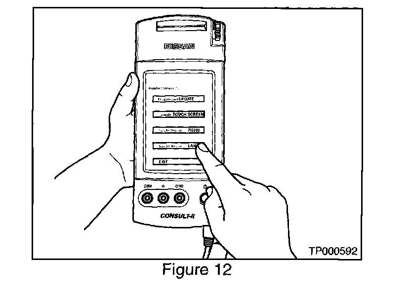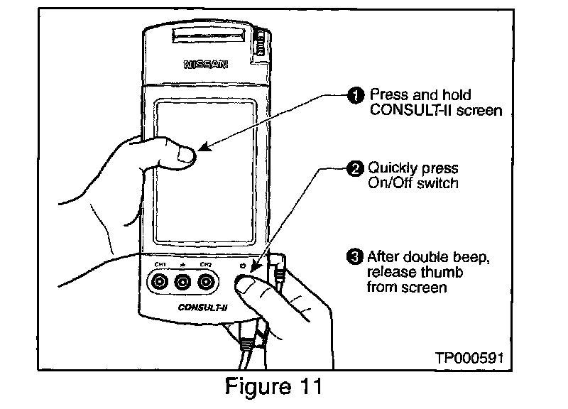 A. While pressing on the CONSULT-II screen with your thumb, quickly depress and release the ON/OFF switch (see Figure 11).