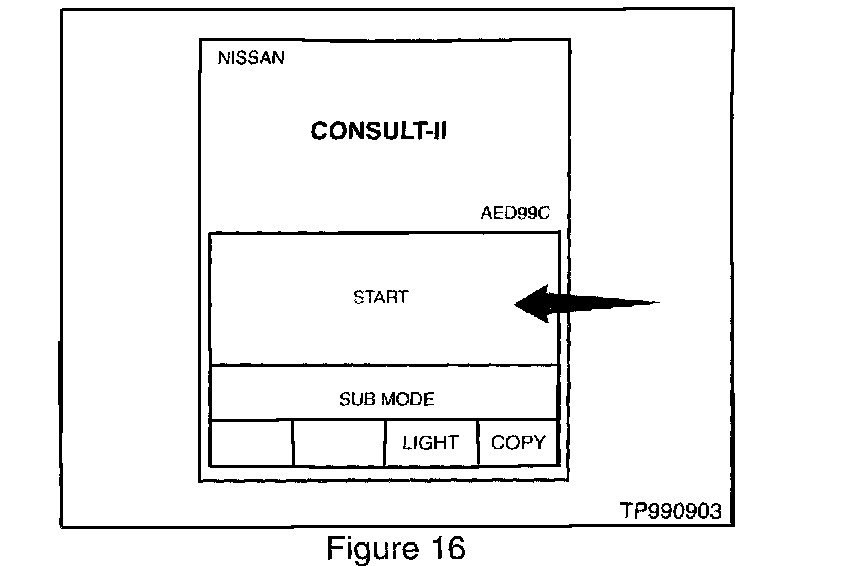 15. Turn the ignition switch "ON" (do not start the engine). Press CONSULT-II's ON button if it does not turn on automatically with the ignition switch (see Figure 16).