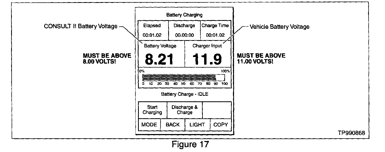 17. Refer to Figure 17. The vehicle battery voltage is "Charger Input". "Battery Voltage" is CONSULT-II's battery voltage.