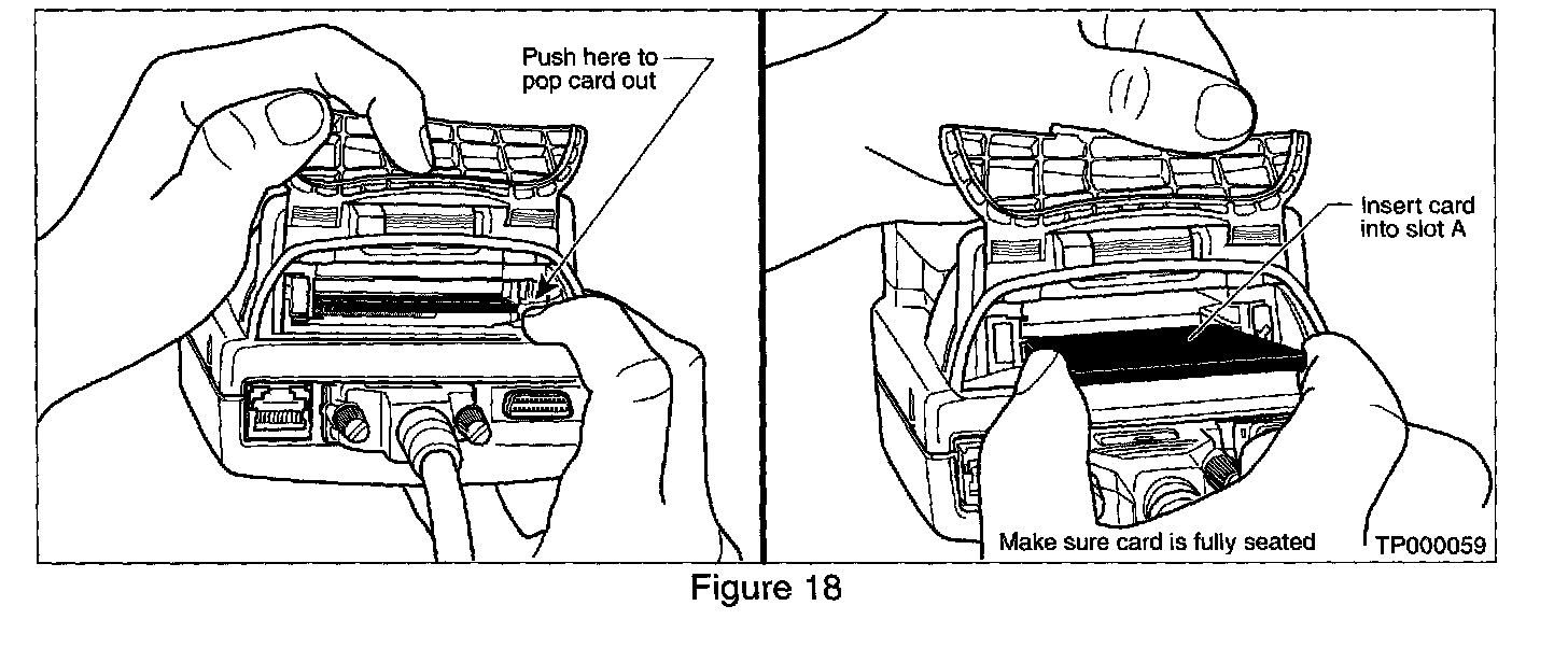 19. Remove the Diagnostics (blue) card from slot A of CONSULT II and install the ECM Reprogramming card (orange) into slot A (see Figure 18).