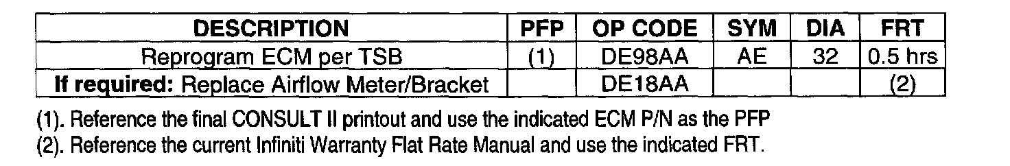 ^ Perform ECM Reprogramming. This is required if the ECM Part Number (P/N) in the vehicle matches one of those listed under "Current ECM P/N" in Chart A-1 or A-2.