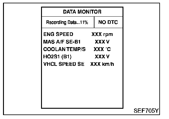 At the moment a malfunction is detected by ECM, "MONITOR" in "DATA MONITOR" screen is changed to "Recording Data ... xx%" as shown, and the data after the malfunction detection is recorded. Then when the percentage reached 100%, "REAL-TIME DIAG" screen is displayed. If "STOP" is touched on the screen during "Recording Data ... xx%", "REAL-TIME DIAG" screen is also displayed.