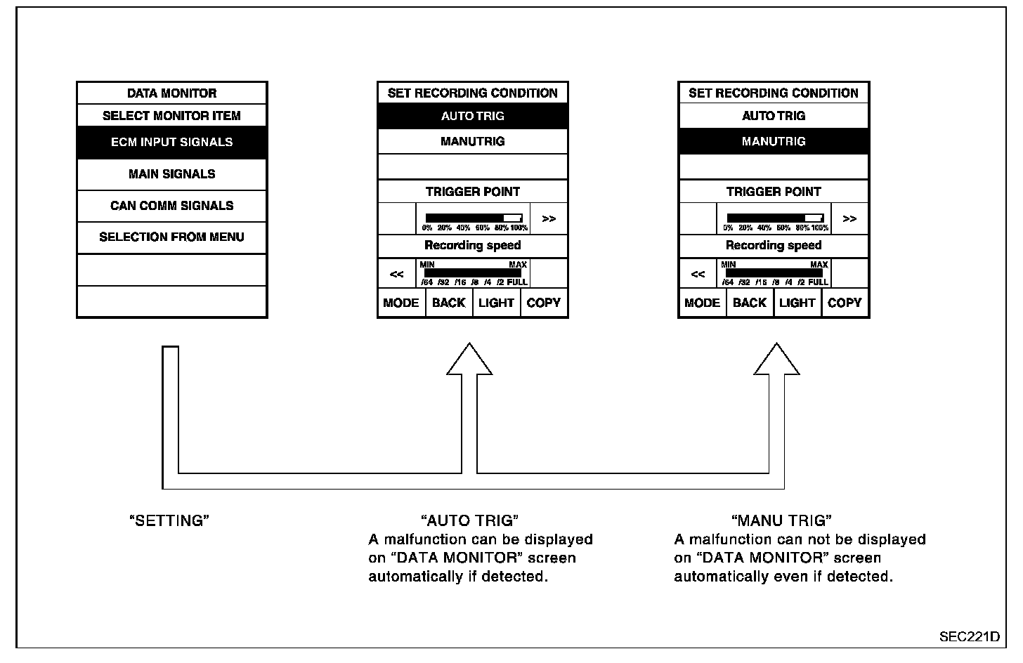 REAL TIME DIAGNOSIS IN DATA MONITOR MODE (RECORDING VEHICLE DATA)CONSULT-II has two kinds of triggers and they can be selected by touching "SETTING" in "DATA MONITOR" mode.
