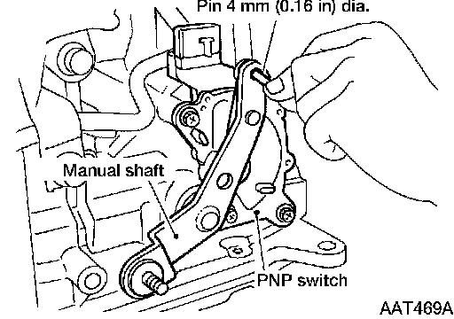 4. Insert pin into adjustment holes in both Park/Neutral Position (PNP) switch and manual shaft as near vertical as possible.