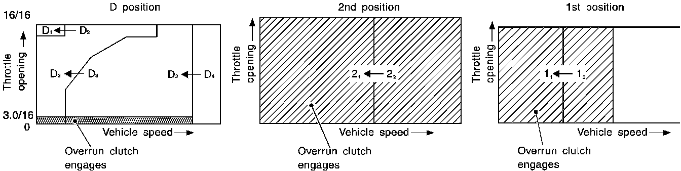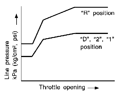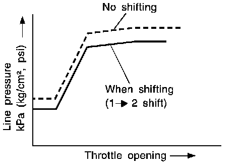 ^ Line pressure is increased to a maximum irrespective of the throttle opening when fluid temperature drops to -10°C (14°F). This pressure rise is adopted to prevent a delay in clutch and brake operation due to extreme drop of fluid viscosity at low temperature.
