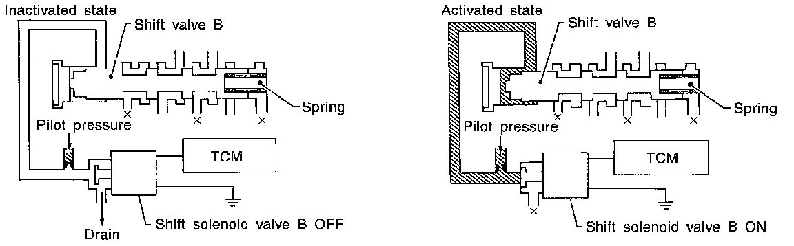 The drawing above shows the operation of shift valve B. When the shift solenoid valve is ON, pilot pressure applied to the end face of the shift valve overcomes spring force, moving the valve upward.