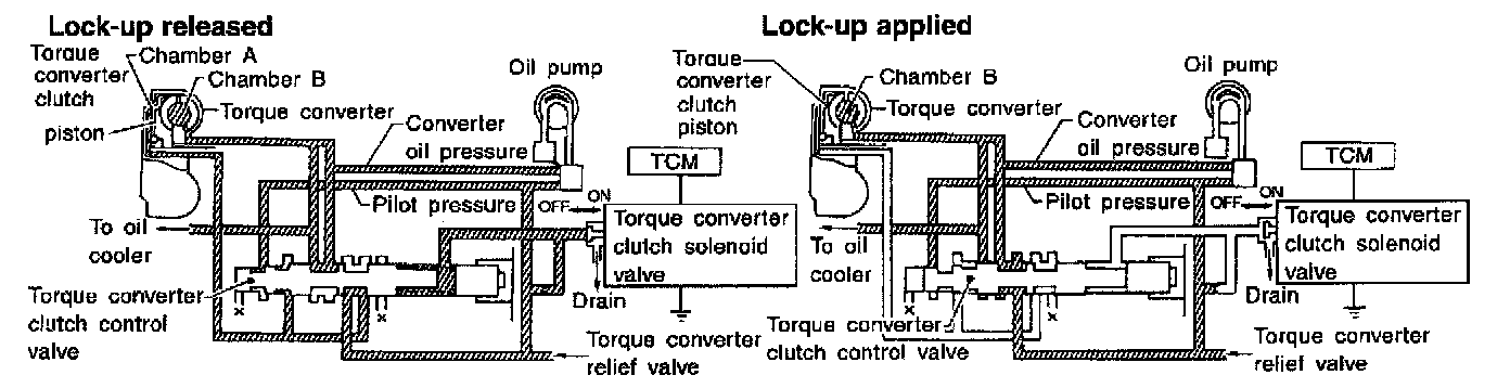 The torque converter clutch piston in the torque converter is locked to eliminate torque converter slip to increase power transmission efficiency. The solenoid valve is controlled by an ON-OFF duty signal sent from the TCM. The signal is converted to an oil pressure signal which controls the lock-up piston.