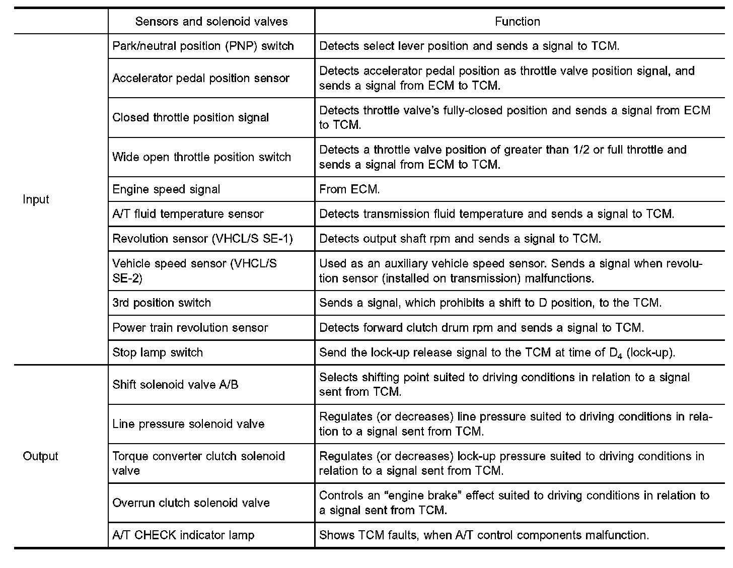 The automatic transaxle senses vehicle operating conditions through various sensors. It always controls the optimum shift position and reduces shifting and lock-up shocks.