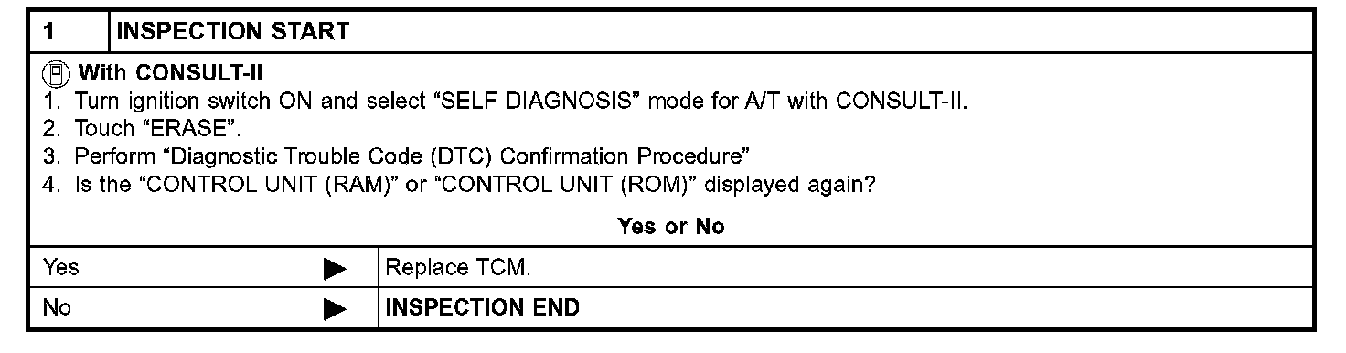 Diagnostic trouble code CONTROL UNIT (RAM), CONTROL UNIT (ROM) with CONSULT-II is detected when TCM memory (RAM) or (ROM).