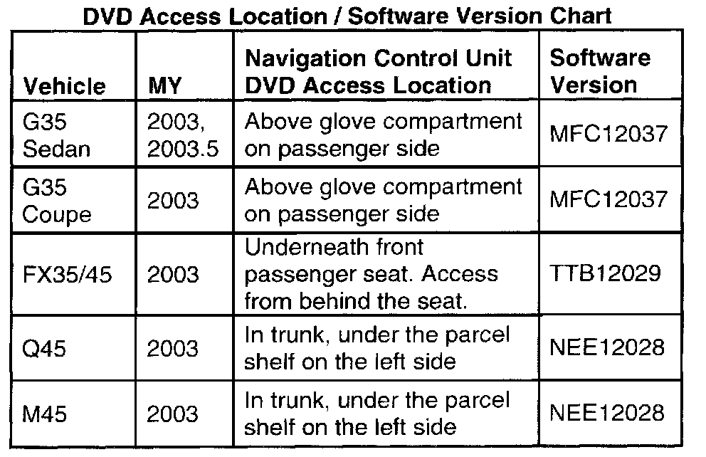 Perform the Software Upgrade Loading Procedure, using the Navigation System software upgrade CD-ROM that will be mailed to Infiniti dealers.
