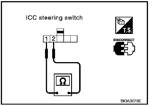 Check resistance between ICC steering switch terminals 1 and 2 by depressing each switch.