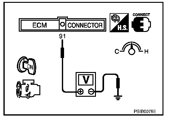 3. Check voltage between ECM terminal 91 (Mass air flow sensor signal) and ground.