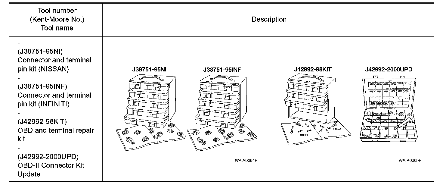 The connector and terminal pin kits contain some of the most commonly used NISSAN/INFINITI connectors and terminals. For detailed connector and terminal pin replacement procedures refer to the latest NISSAN/INFINITI CONNECTOR AND TERMINAL PIN SERVICE MANUAL.