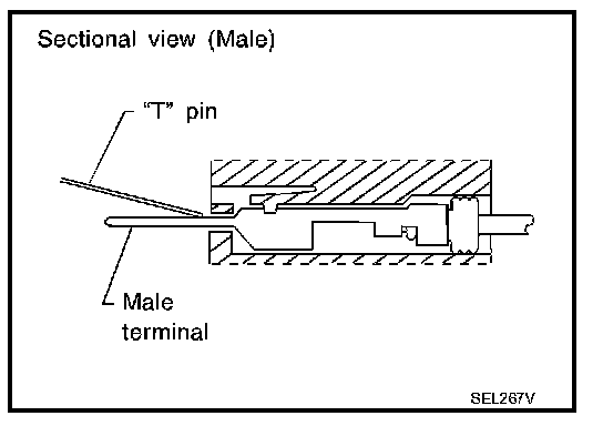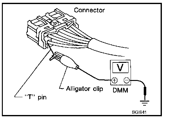 The probe of a digital multimeter (DMM) may not correctly fit the connector cavity. To correctly probe the connector follow the procedures using a "T" pin. For the best contact grasp the "T" pin using an alligator clip.