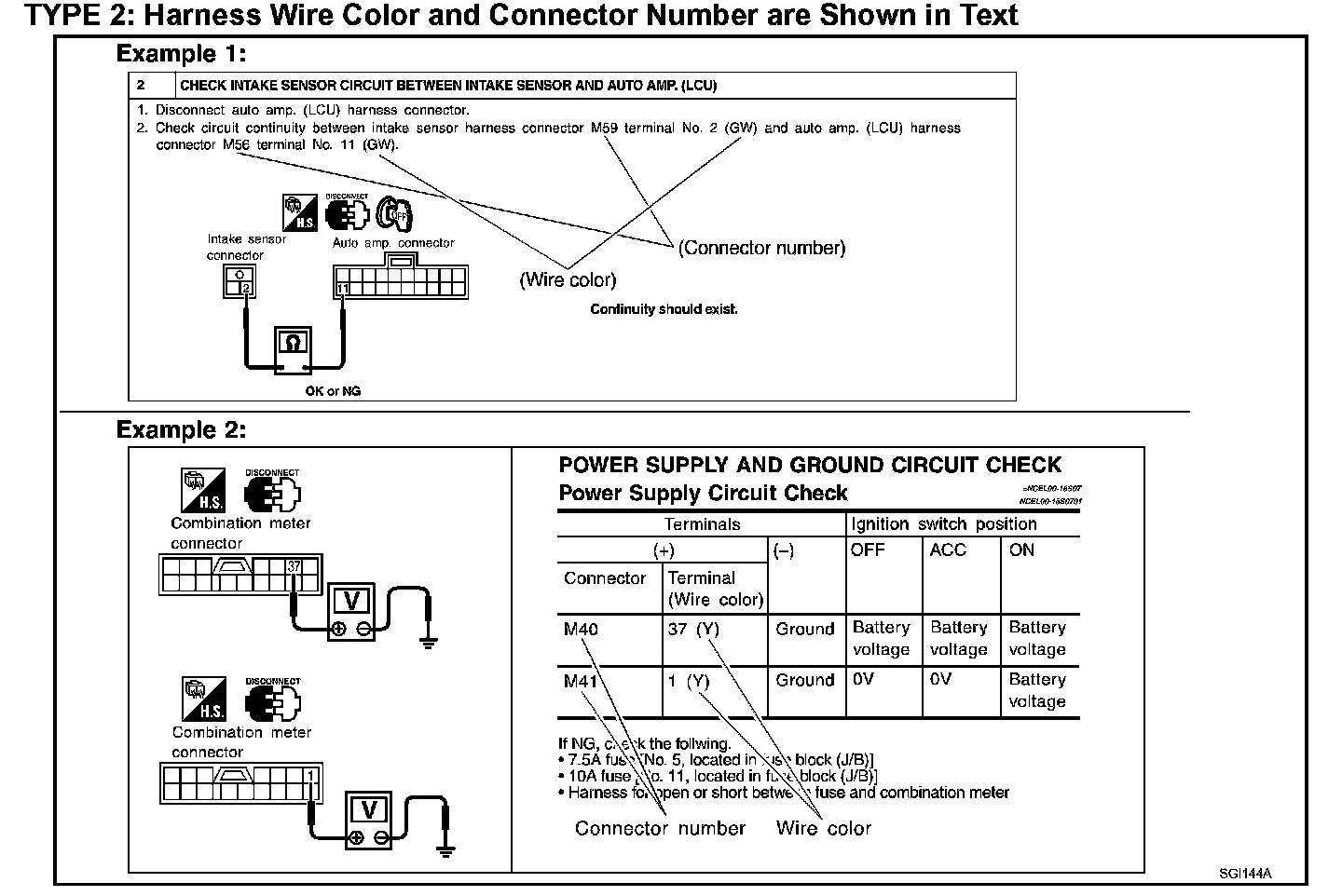 TYPE 2: Harness Wire Color and Connector Number are Shown in Text