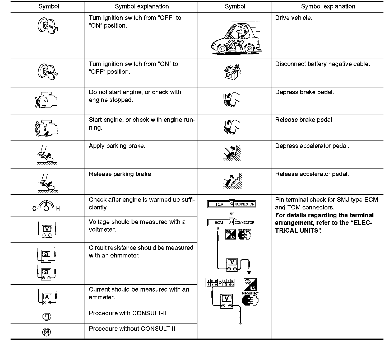 Symbols included in illustrations refer to measurements or procedures. Before diagnosing a problem familiarize yourself with each symbol. Refer to "Connector Symbols" and "KEY TO SYMBOLS SIGNIFYING MEASUREMENTS OR PROCEDURES".
