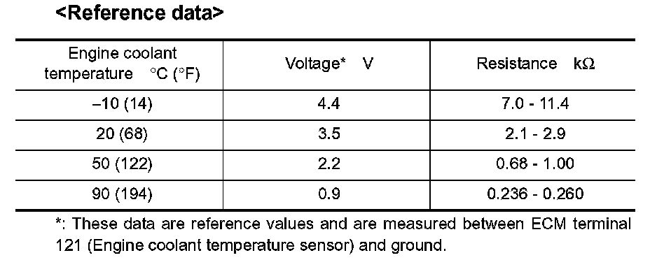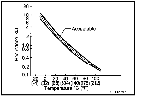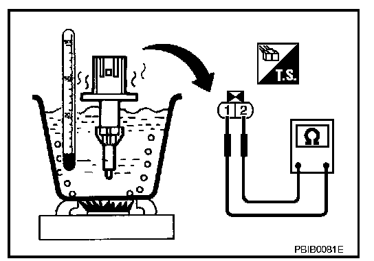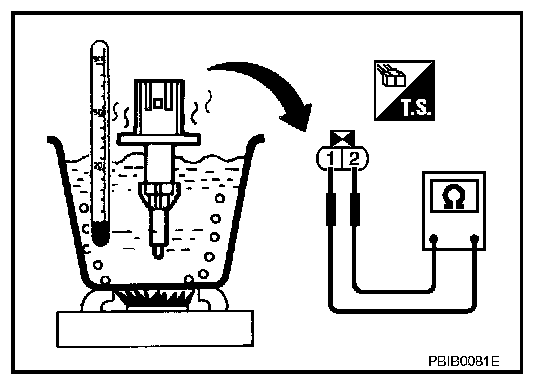 ENGINE COOLANT TEMPERATURE SENSOR1. Check resistance between engine coolant temperature sensor terminals 1 and 2 as shown in the figure.