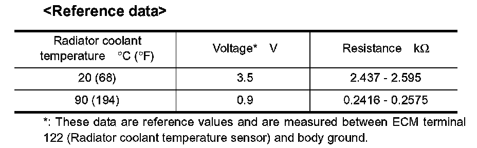 1. Check resistance between radiator coolant temperature sensor terminals 1 and 2 as shown in the figure.