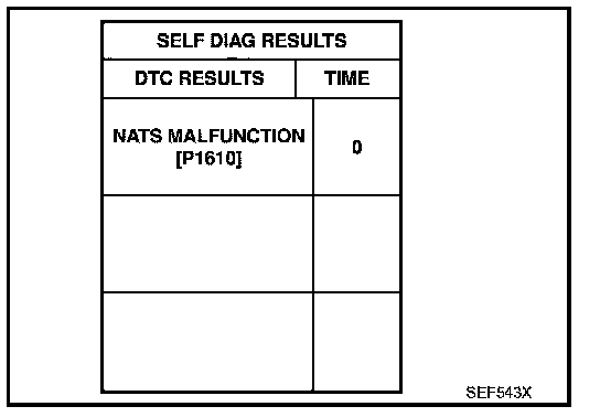 - If the security indicator lights up with the ignition switch in the "ON" position or "NATS MALFUNCTION" is displayed on "SELF-DIAG RESULTS" screen, perform self-diagnostic results mode with CONSULT-II using NATS program card. Refer to "IVIS (INFINITI VEHICLE IMMOBILIZER SYSTEM-NATS)". Antitheft and Alarm Systems