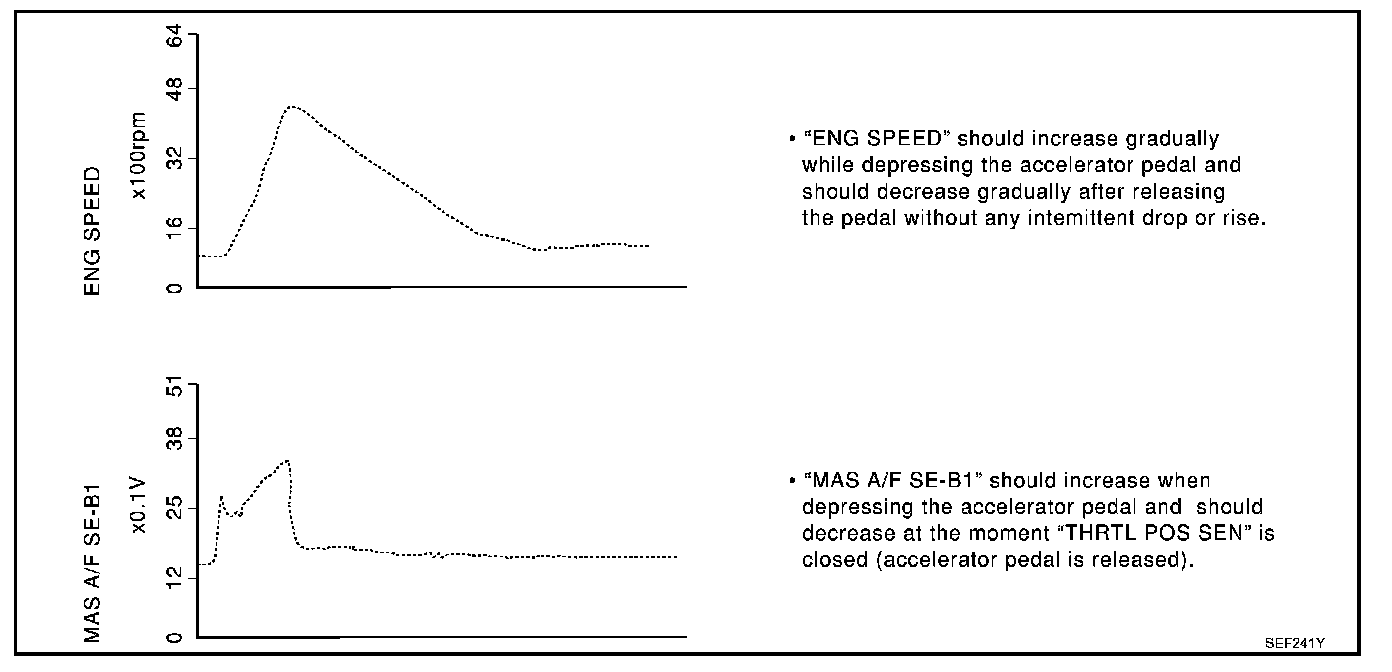The signal of "ACCEL SEN 1" and "THRTL SEN 1" should rise gradually without any intermittent drop or rise after "CLSD THL POS" is changed from "ON" to "OFF".
