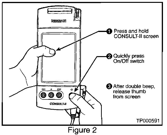 A. While pressing on the CONSULT-II screen with your thumb, quickly depress and release the ON/OFF switch (see Figure 2).