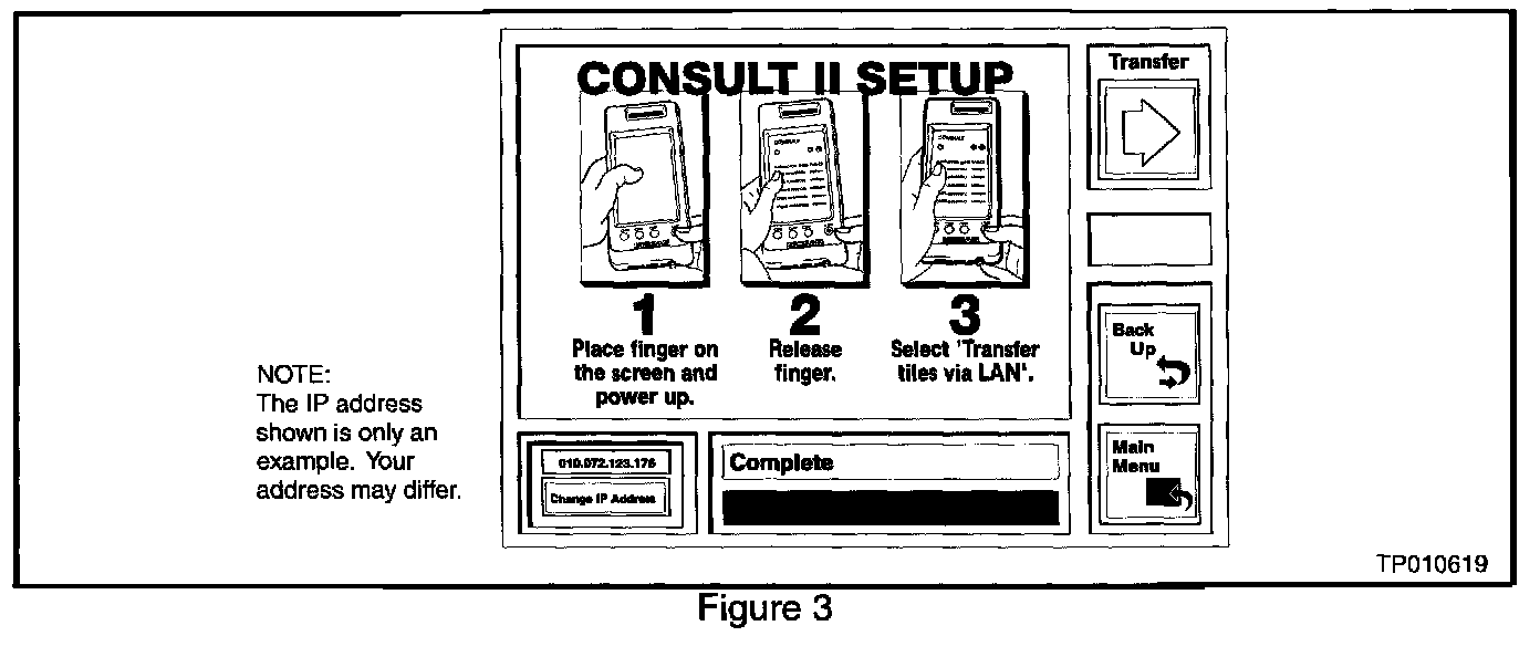 DO NOT DISCONNECT THE ETHERNET CABLE UNTIL "COMPLETE" IS DISPLAYED AS SHOWN IN FIGURE 3. If the cable is disconnected before "Complete" is displayed you MUST restart the download procedure. Otherwise TCM damage can occur.