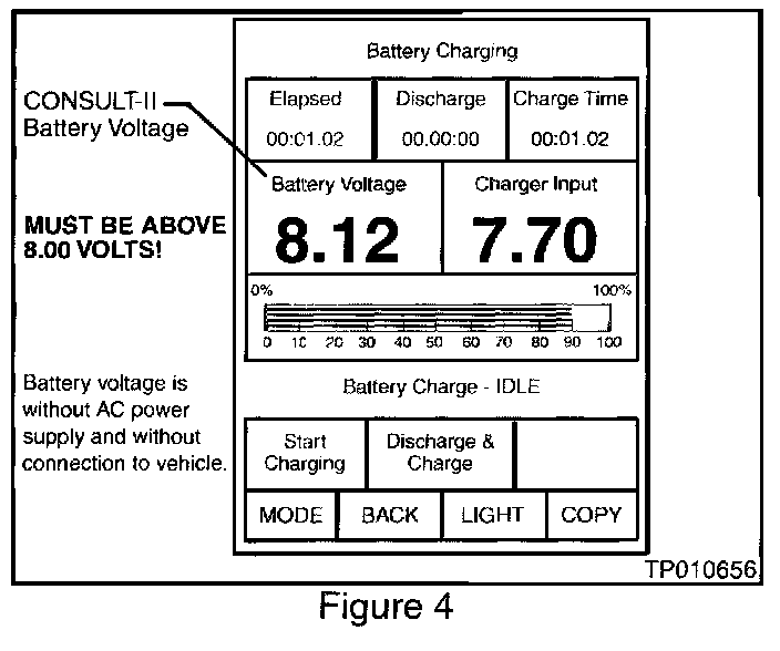 26. After about one minute has passed, check the CONSULT-II's battery voltage reading on the CONSULT-II screen (see Figure 4).