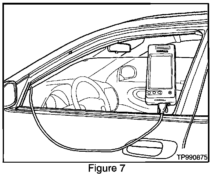 35. Roll down the driver's window part way, exit the vehicle, close the door and hang the CONSULT-II unit on the outside of the window (see Figure 7).