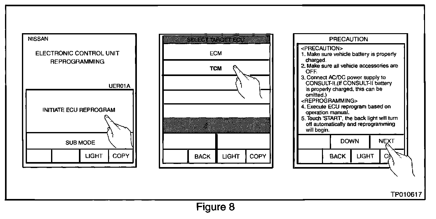 ^ Charge the CONSULT-II battery before proceeding with TCM Reprogramming