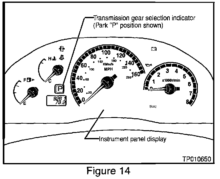 61. Depress the brake pedal and move the shift lever from "P" to "R" to "N" to "D", making sure the indicator next to the speedometer (see Figure 14) correctly displays each selected shift lever position.