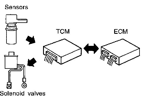 The TCM also communicates with the ECM by means of a signal sent from sensing elements used with the OBD-related parts of the A/T system for malfunction-diagnostic purposes. The TCM is capable of diagnosing malfunctioning parts while the ECM can store malfunctions in its memory.