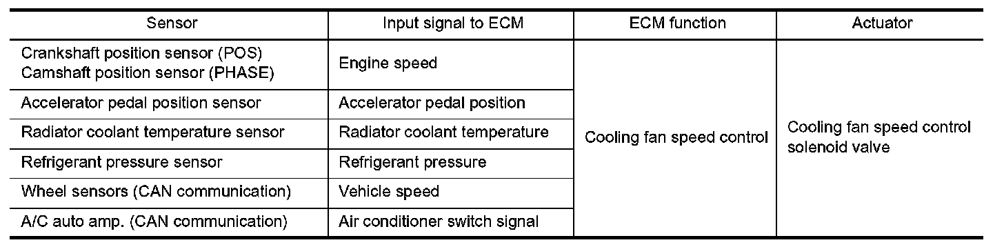 The ECM controls the cooling fan speed corresponding to the engine speed, the radiator coolant temperature, refrigerant pressure, vehicle speed, air conditioner switch signal, etc.