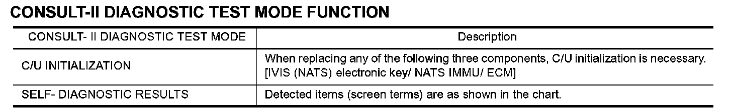 NOTE: When any initialization is performed, all ID numbers previously registered will be erased and all IVIS (NATS) electronic keys must be registered again. The engine cannot be started with an unregistered key. The system will show DIFFERENCE OF KEY or LOCK MODE as a self diagnostic result on the CONSULT-II screen.