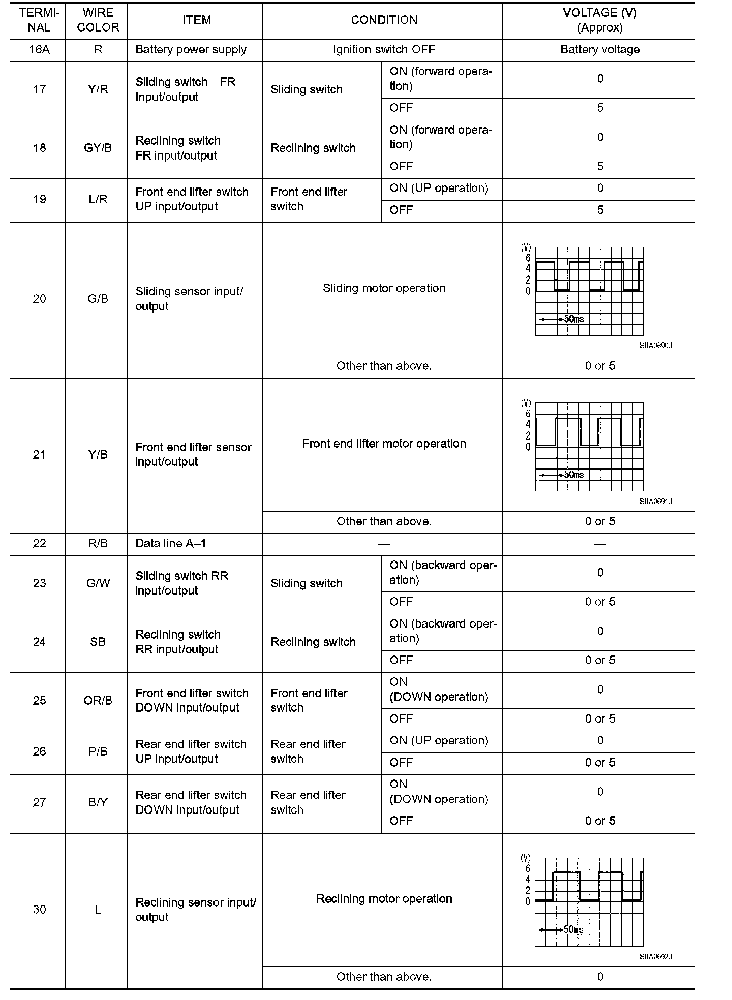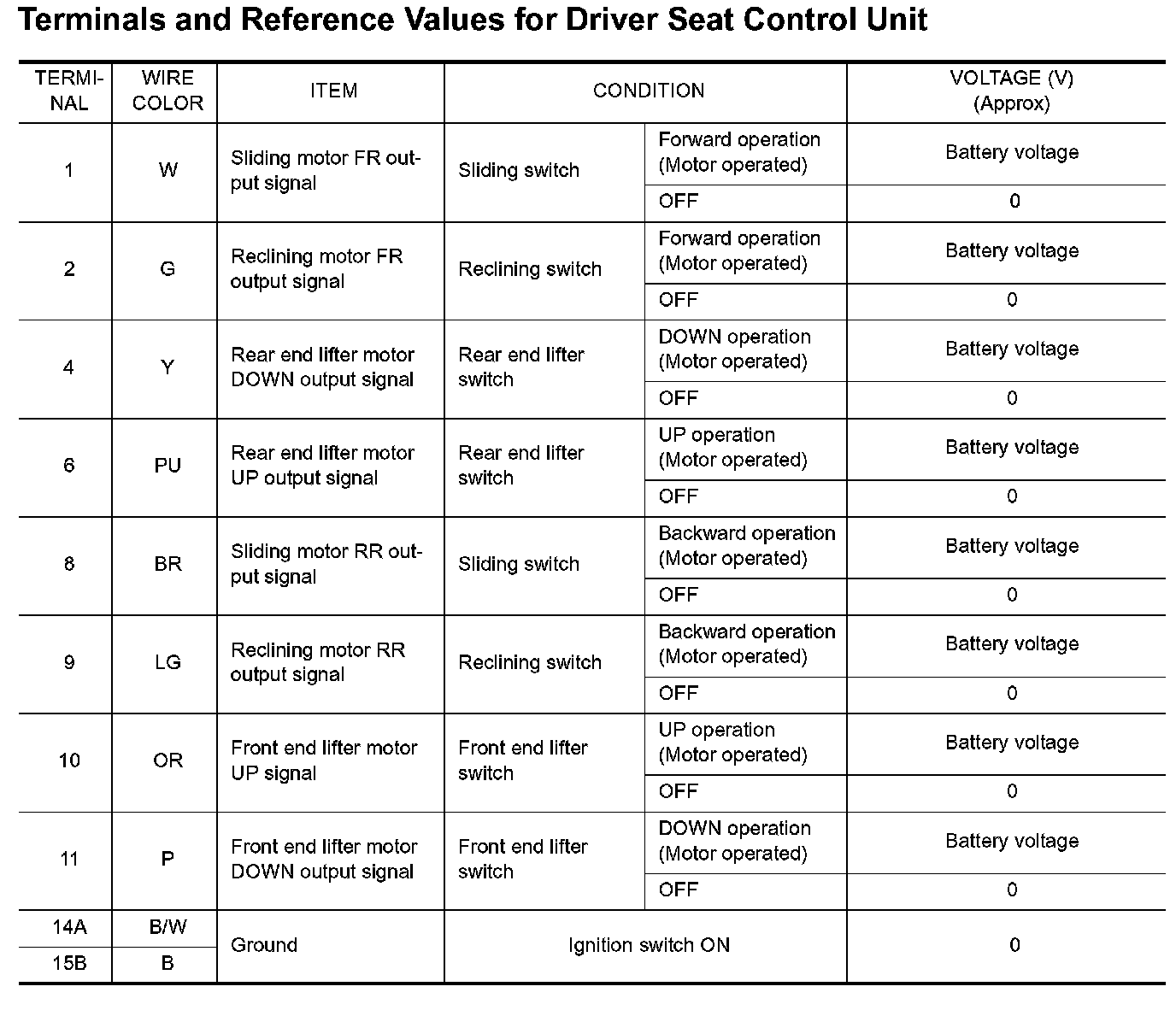Terminals And Reference Values For Driver Seat Control Unit Part 2:
